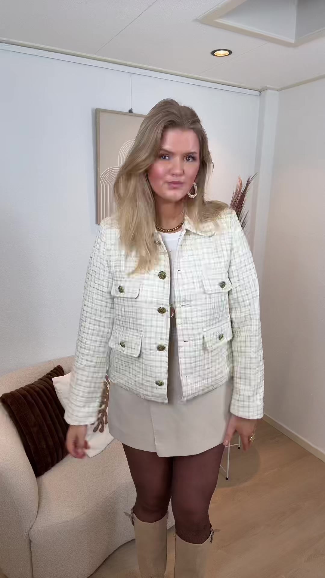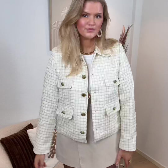 Dit crème jasje heeft een prachtige tweed-achtige structuur en luxe gouden knopen.