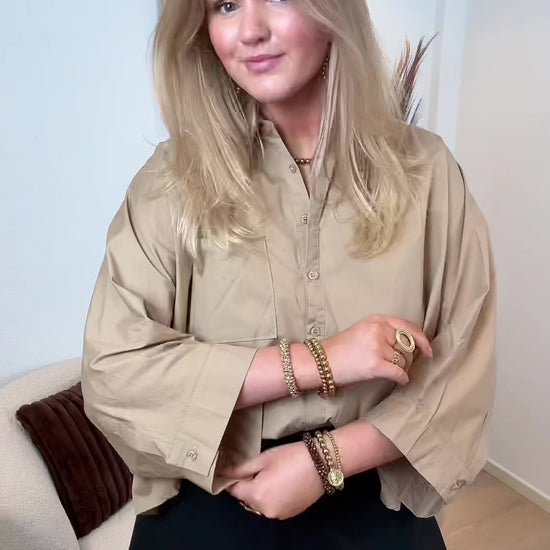 Onze oversized blouse blouse heeft een losse pasvorm, wijde mouwen en een warme beige kleur.