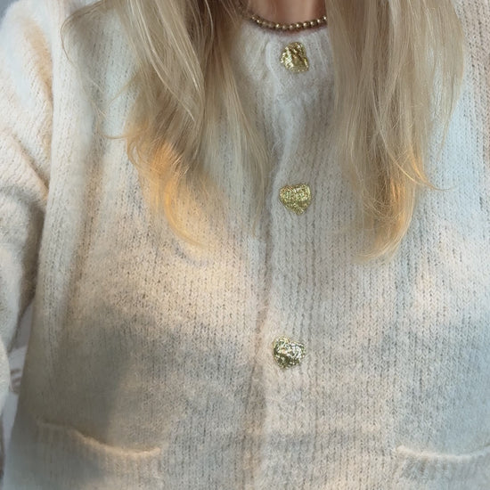Dit fijne vestje heeft prachtige gouden knoopjes in hartvorm die zorgen voor een elegante, vrouwelijke touch. Perfect om casual te dragen of juist classy te stylen.