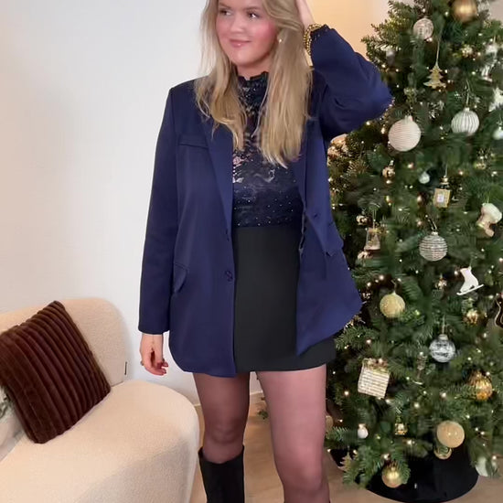 De prachtige donkerblauwe kant is voorzien van kleine sparkles waardoor hij subtiel glam oogt, zonder overdreven te zijn. De mouwtjes hebben een elegante pof en het geheel zit mooi aangesloten.