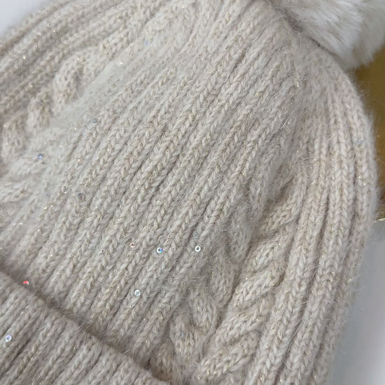 Een superzachte, gebreide beanie in een warme crème tint, afgewerkt met subtiele glinstertjes en een fluffy pom bovenop.